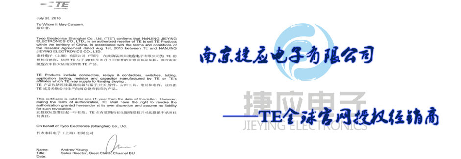 南京捷應(yīng)電子有限公司是國(guó)際無(wú)源器件品牌美國(guó)泰科電子(TE)在中國(guó)華東地區(qū)的主要通路商,代理經(jīng)銷(xiāo)旗下全系列產(chǎn)品包括TYCO(AMP)系列連接器、接插件、OEG、SCHRACK、P&B功率繼電器、美國(guó)RACHEM各類(lèi)航空導(dǎo)線、熱縮套管、模縮套、標(biāo)識(shí)產(chǎn)品、電線電纜。